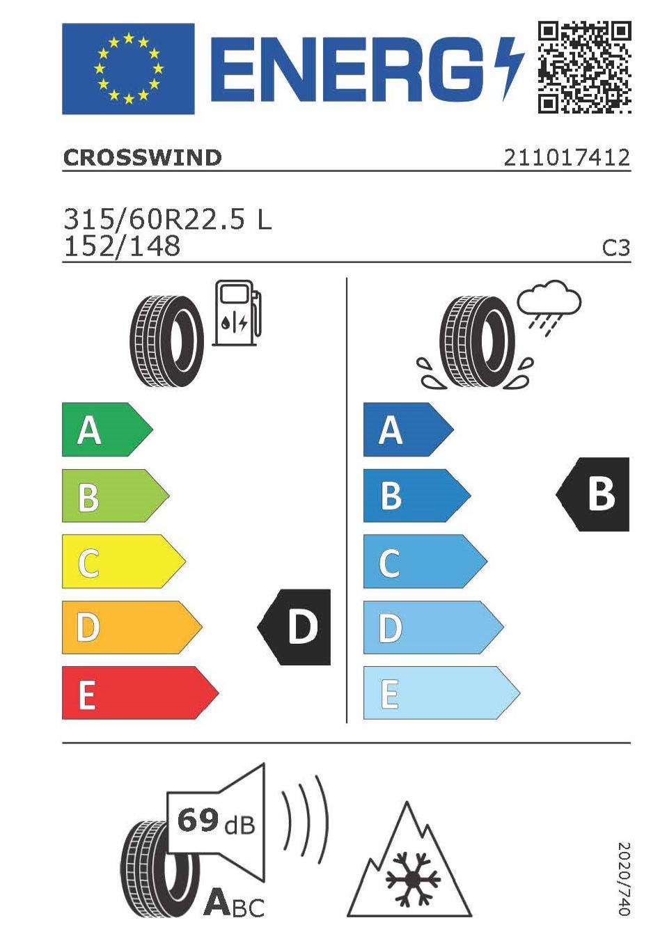 Rozměr 315/60 R22.5 je doplněný o index nosnosti 152/148 (3550/3150 kg) a rychlostní index L (do 120 km/h). Na EU štítku je pneumatika uvedena s hodnotami D (valivý odpor), B (přilnavost na mokru) a 69 dB (třída A).