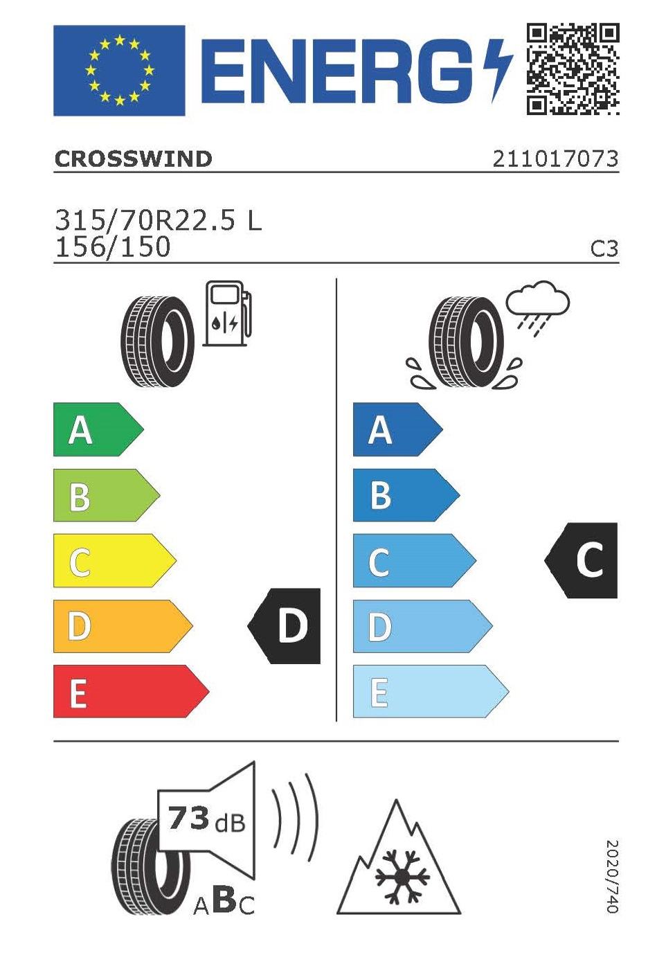 CROSSWIND CWS10E (CCW CWS10ES) v rozměru 315/70R22.5 je ekonomická nákladní pneumatika pro vodicí (přední) nápravu v dálkovém provozu. 156/150L (4000/3350 kg), 3PMSF (sněhový grip). EU štítek: D / C / 73 dB (B).