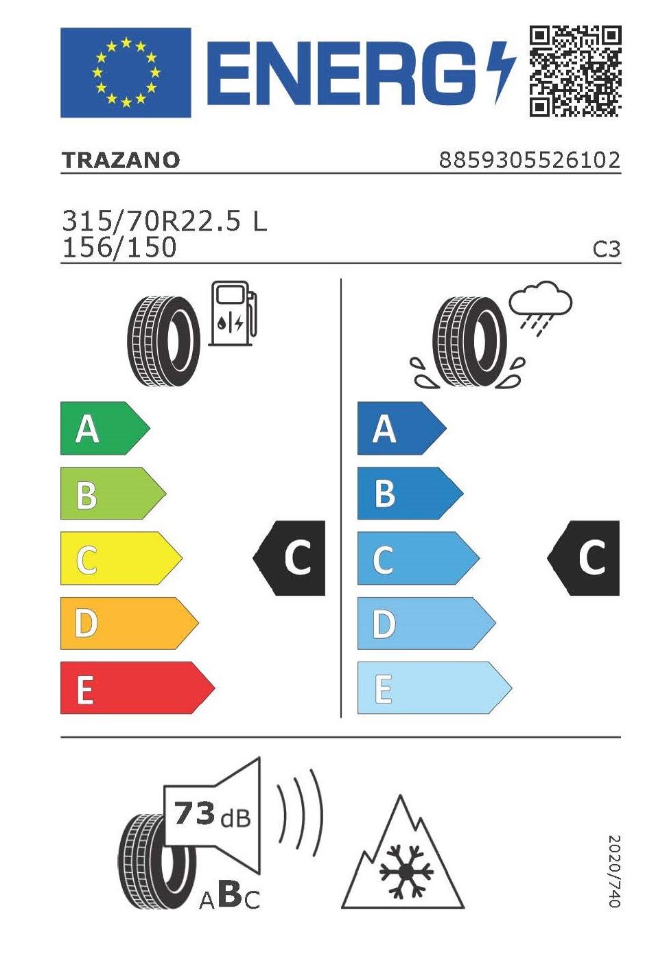 Rozměr 315/70 R22.5 je doplněný o index nosnosti 156/150 (4000/3350 kg) a rychlostní index L (do 120 km/h). Pneumatika má značení M+S i 3PMSF. Podle EU štítku vychází valivý odpor C, přilnavost na mokru C a hluk 73 dB (třída B).